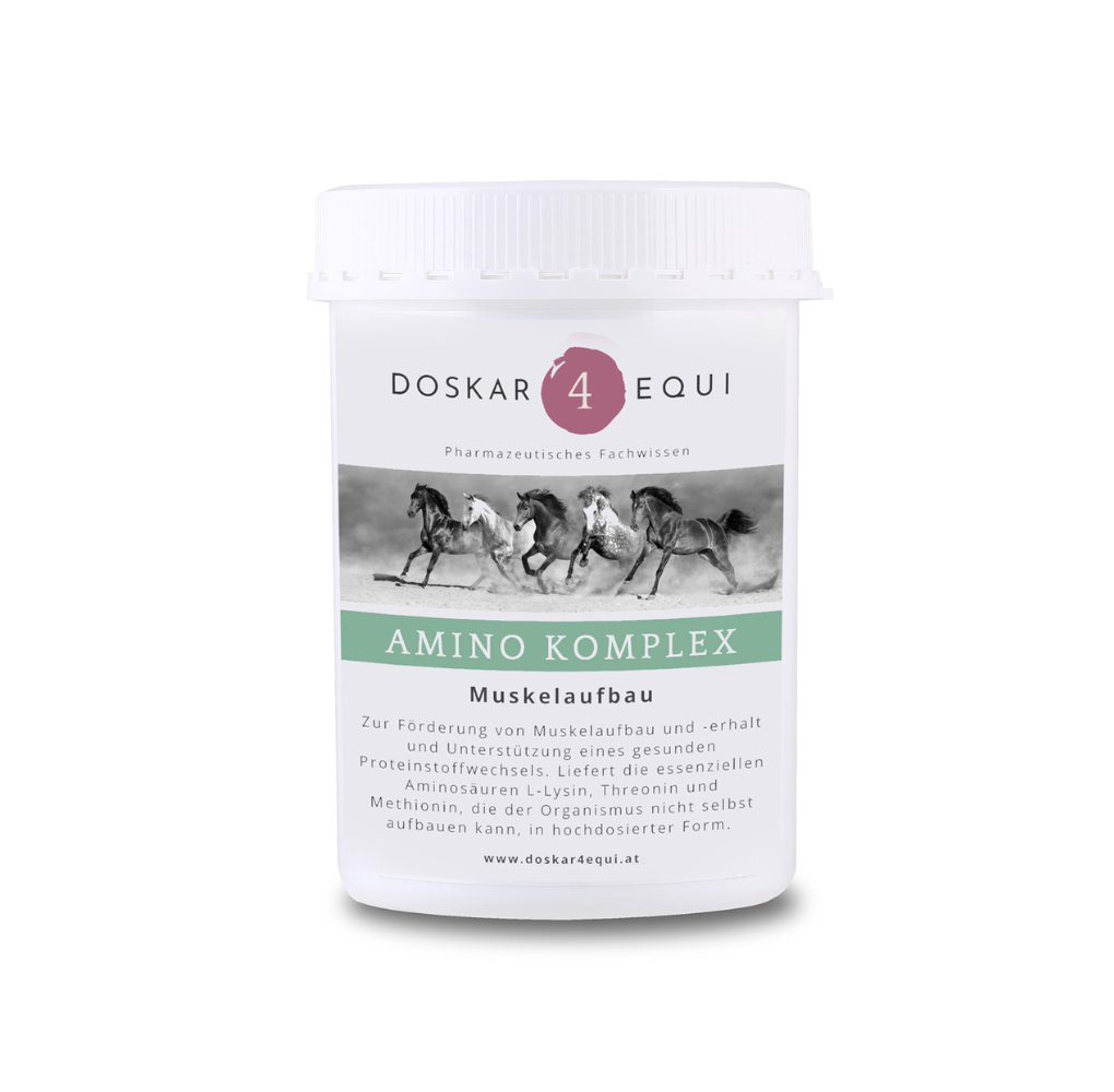 Amino Komplex liefert die essentiellen Aminosäuren L-Lysin, Threonin und Methionin in hochdosierter Form – genau dort, wo die Grundversorgung durch Heu und Kraftfutter häufig nicht ausreicht. Diese drei limitierenden Aminosäuren weisen bei Pferden regelmäßig Versorgungslücken auf und sind für Muskelaufbau, Stoffwechsel und Vitalität entscheidend.