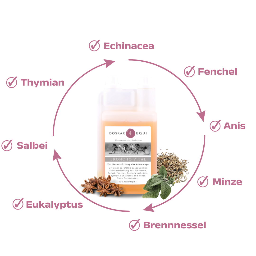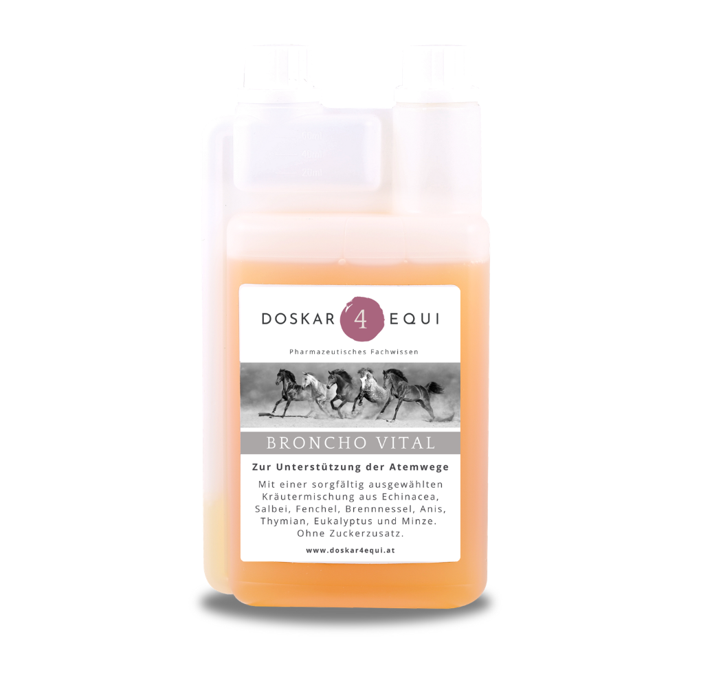 Unsere Rezeptur wurde speziell entwickelt, um die Atemwege zu unterstützen und den Organismus insbesondere bei erhöhter Belastung durch Witterungswechsel oder staubige Stallluft zu entlasten.