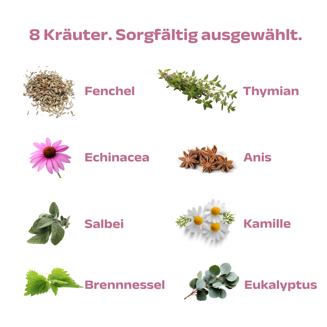 Eine abgestimmte Mischung aus Echinacea, Brennnessel, Thymian, Eukalyptus, Minze, Salbei, Fenchel und Anis.