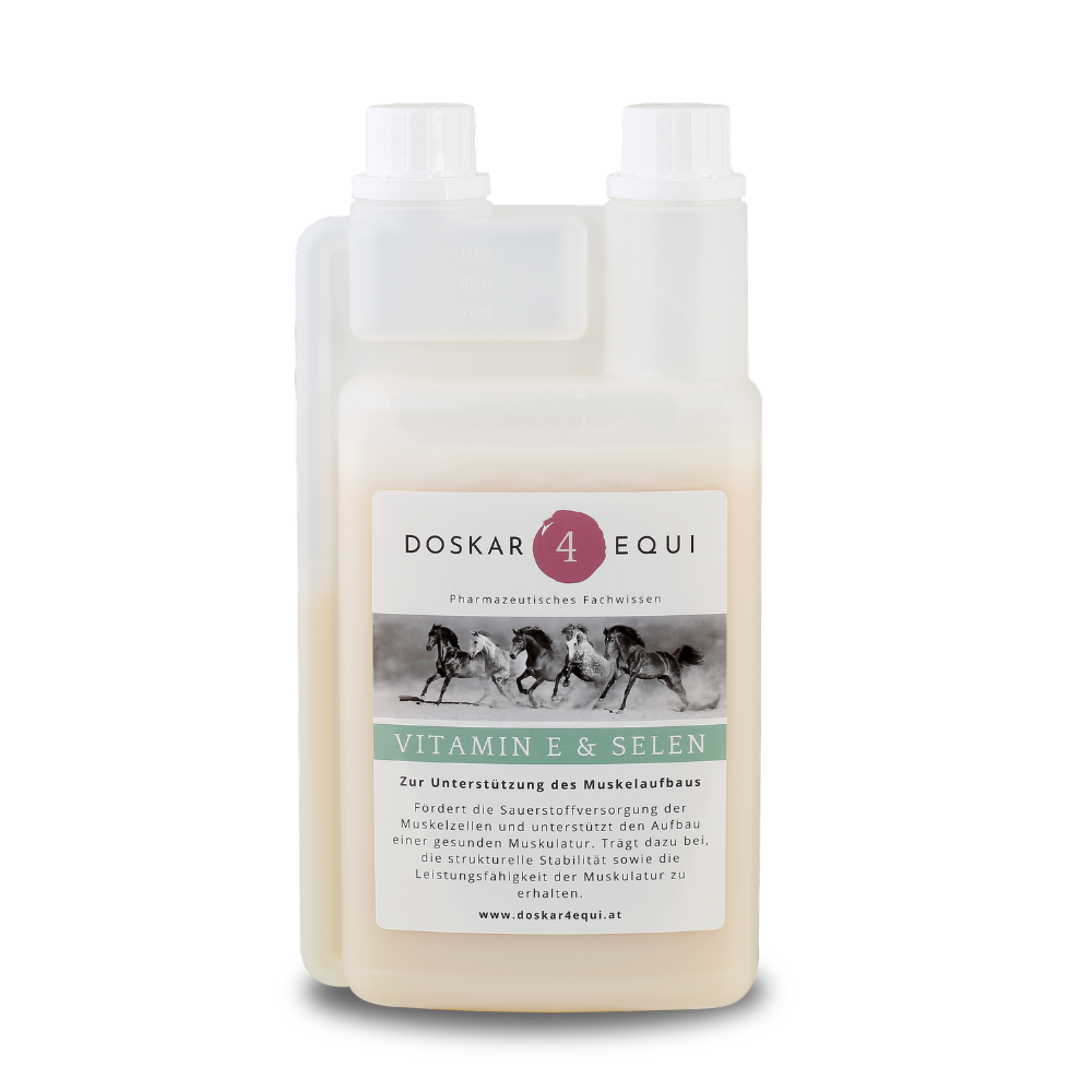Vitamin E & Selen Liquid wurde entwickelt, um Pferde gezielt und hochdosiert mit zwei der wichtigsten Mikronährstoffe für Muskulatur und Zellschutz zu versorgen – in flüssiger Form für eine optimale Aufnahme.
