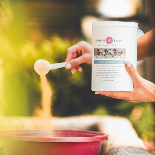 Glucosamin ist ein Grundbaustoff für Knorpel, Sehnen und Bänder und stimuliert die Produktion der körpereigenen Knorpelbausteine, die für die Regeneration und Reparatur der Knorpelsubstanz verantwortlich sind. In ihrem Zusammenwirken unterstützen die in DOSKAR 4 EQUI enthaltenen Gelenknährstoffe Chondroitin und Glucosamin die gesunde Funktion der Gelenksknorpel. Sowohl bei älteren Pferden, als auch durch erhöhte Belastung ist die natürliche Versorgung nicht immer ausreichend gegeben und es kommt oft zu Abnützungen. DOSKAR 4 EQUI Articulus unterstützt den Bewegungsapparat des Pferdes zusätzlich mit MSM, Kollagen, Weidenrinde und Kurkumawurzel.