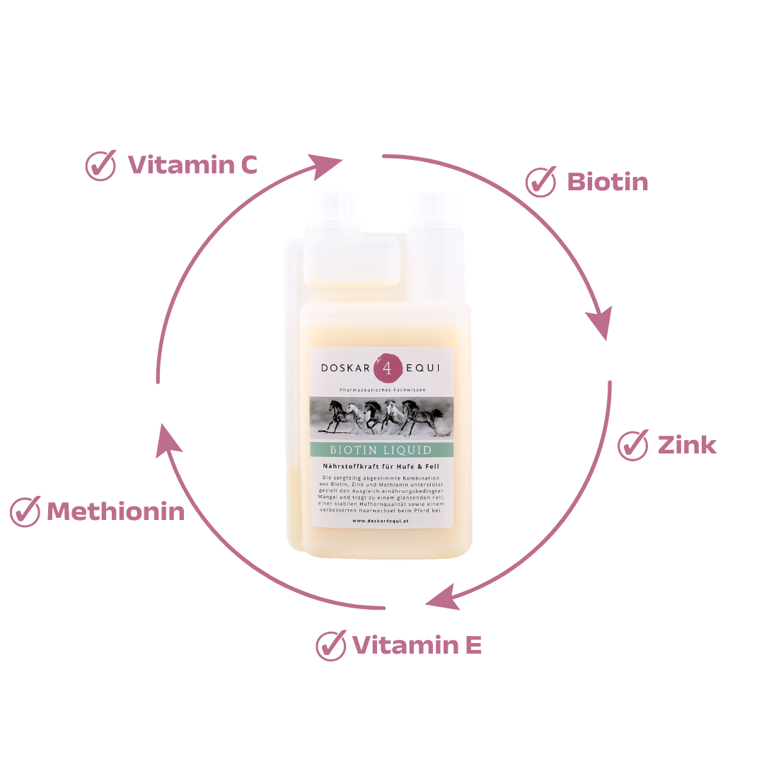 Biotin Liquid ist ein hochwertiges, flüssiges Ergänzungsfuttermittel für Pferde, das gezielt zur Förderung gesunder Hufe, einer stabilen Hautbarriere sowie eines glänzenden, dichten Fells entwickelt wurde. Die Kombination aus essenziellen Mikronährstoffen, Vitaminen und natürlichen Trägerölen macht es besonders effektiv in der täglichen Versorgung – insbesondere in Phasen mit erhöhtem Bedarf wie Fellwechsel, bei rissigen Hufen oder Hautirritationen.
