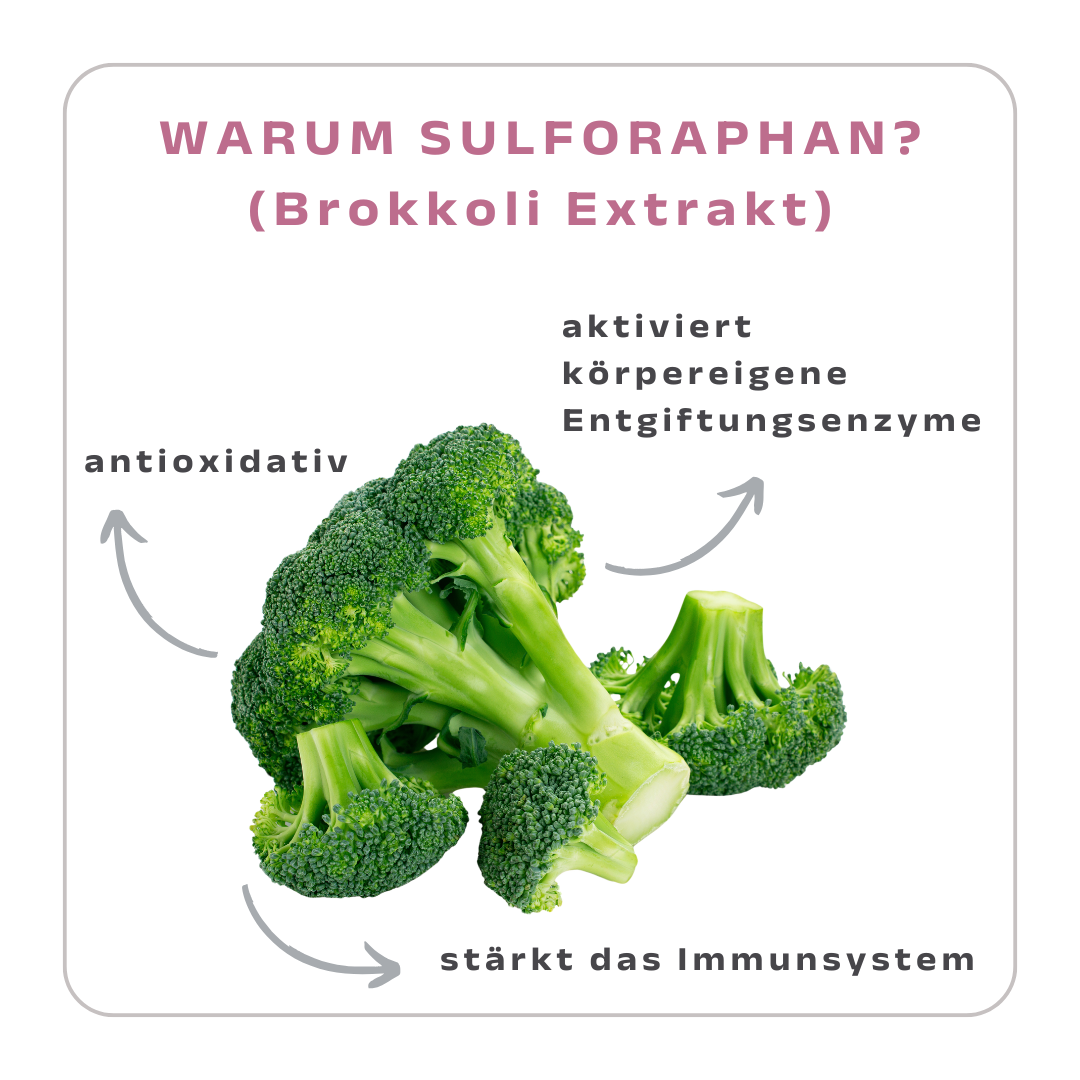 Sulforaphan ist ein natürlicher Pflanzenstoff aus der Gruppe der Isothiocyanate, der vor allem in Kreuzblütlern vorkommt – besonders in Brokkoli und noch stärker in Brokkolisprossen. Sulforaphan liegt in der Pflanze nicht fertig vor – es entsteht erst wenn die Pflanzenzelle verletzt wird, zum Beispiel durch Kauen oder Zerkleinern. Dabei trifft die Vorstufe Glucoraphanin auf das Enzym Myrosinase und wird in das aktive Sulforaphan umgewandelt. Das Besondere: Die eigentliche Wirkung kommt von innen. Sulforaphan gibt dem Körper den Impuls, seine eigenen Schutzprozesse anzustoßen und der Körper beginnt, mehr von seinen eigenen Schutzenzymen herzustellen. Es geht also nicht nur darum, was gefüttert wird, sondern, was im Körper daraus entsteht.