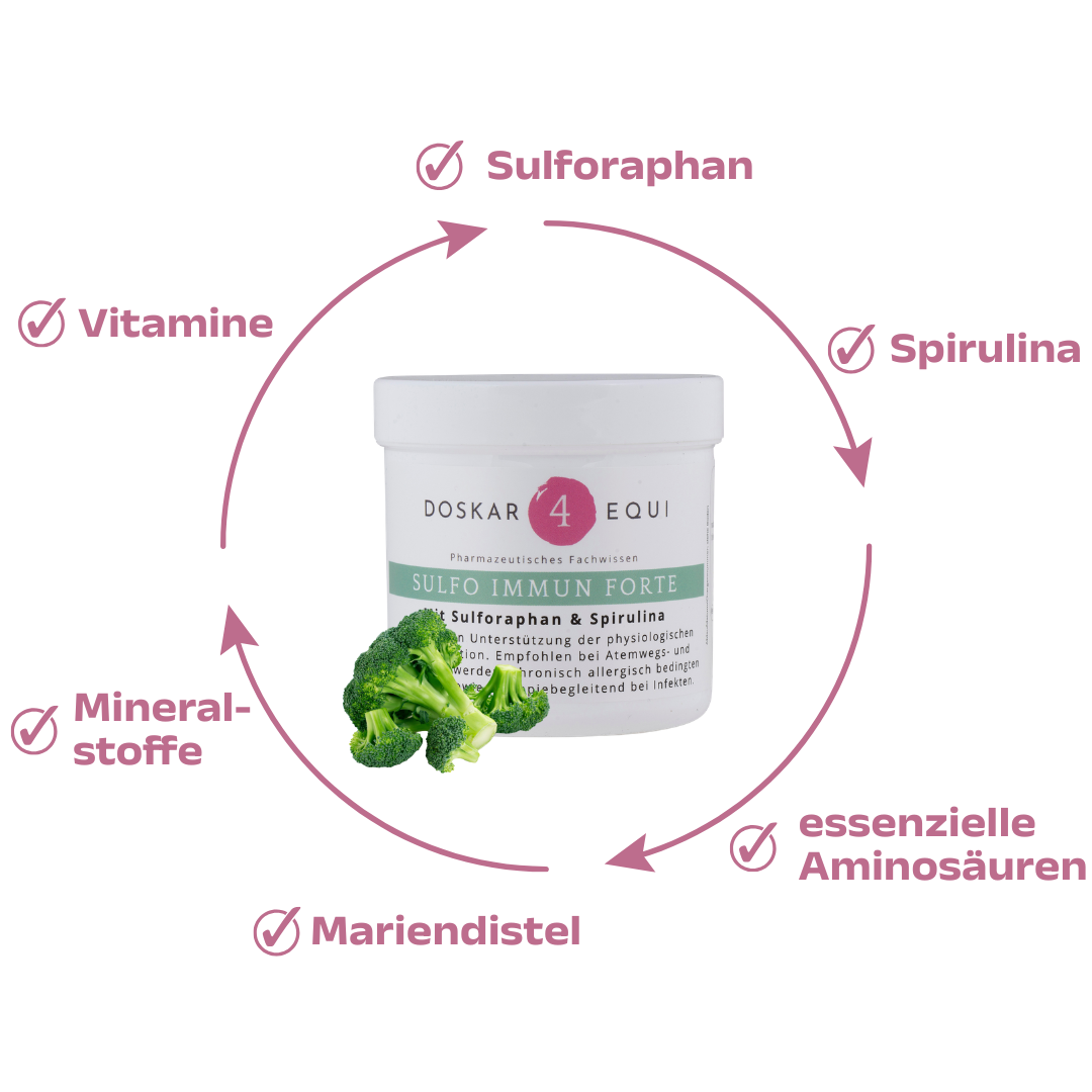 Sulfo Immun Forte verwendet Sulforaphan Smart – eine speziell entwickelte Wirkstoffmatrix aus natürlichem Brokkoli-Konzentrat kombiniert mit speziellen Enzymen. So wird der Wirkstoff optimal vorbereitet und im Verdauungstrakt bestmöglich verfügbar gemacht.